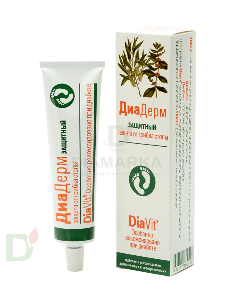 <h2>Ваша кожа под защитой DiaVit</h2> Продукция ДиаВит нацелена на устранение и профилактику свойственных для диабетиков проблем кожи и полости рта. Кремы ДиаДерм эффективны в борьбе с сухостью, воспалениями, шелушениями, трещинками и опрелостями. Они отлично питают, восстанавливают и увлажняют кожу. В то время как линейка ДиаДент не просто борется с бактериями, живущими в полости рта, но и укрепляет десны, устраняет их кровоточивость, уменьшает проявления ксеростомии и освежает дыхание.<br> <h2>“НЕТ” грибку и инфекциям кожи стоп</h2> Крем способствует скорейшему заживлению ранок и трещин на коже, тем самым не давая инфекции проникнуть внутрь. Ряд особых натуральных компонентов работает наружно, профилактируя развитие грибковых и бактериальных заболеваний кожи стоп.<br> <h2>Состав крема ДиаДерм Защитный</h2> вода, цетеариловый спирт, пропиленгликоль, изопропилпальмитат, масло кокосовое, стеарет-2, стеарет-21, глицерин, циклометикон, триизононаноин, изогексадекан, ДЭА ундециленовой кислоты, cтерилдиметикон ,карбамид, витамин Е-ацетат, эфирные масла мяты, лимона и чайного дерева, церезин, витамин А-пальмитат, метилпарабен, пропилпарабен, метилизотиазолинон.