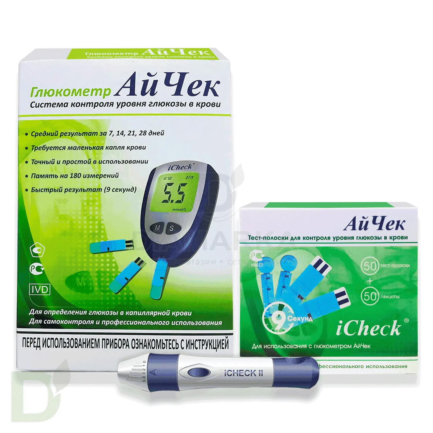 <p> При покупке тест-полосок ланцеты прилагаются<strong> бесплатно</strong>: по 1 ланцету на тест-полоску. Это позволяет значительно экономить. </p> <p> Работать с глюкометром iCheck очень легко и удобно. Достаточно лишь 0,9 мкл крови, чтобы он в течение нескольких секунд показал результат. Данная модель способна не только сохранять результаты измерений, благодаря внутренней памяти, но также с легкостью подсчитывает средний результат за определенный период времени. </p> <p> Рекомендуем купить глюкометр АйЧек<strong> для пожилых людей</strong>, для них это будет лучшее предложение по самоконтролю диабета. </p> <p> В комплекте с глюкометром АйЧек поставляется чехол, прокалыватель и инструкция. </p> <h2>Что могут Тест-полоски АйЧек (iCheck)</h2> <ul> <li>предназначены для использования совместно с глюкометром АйЧек (iCheck). Великолепно подходят как для самостоятельного контроля уровня глюкозы в домашних условиях, так и для применения в условиях стационара. Представляют собой отличное предложение бюджетного класса.</li> <li>очень удобны в использовании, они достаточно широкие, благодаря чему их легко доставать из тубуса. Край полоски имеет особую рекреационную зону, при соприкосновении с которой происходит всасывание крови из пальца. Подобное явление происходит благодаря микрокаппилярной диффузии и делает проведение теста еще более комфортным.</li> <li>позволяют электрохимическим способом определить уровень сахара. Калибровка результатов происходит по цельной капиллярной крови. Для проведения теста достаточно капли объемом 0,9 мкл, кровь для анализа берется из пальца. Время, необходимое для определения количества глюкозы, составляет 9 секунд.</li> <li>способны определять количество сахара в крови в диапазоне 1,7-41,7 Ммоль/л. При этом точность анализа составляет 96%, что является очень хорошим показателем для глюкометров и соответствует требованиям, которые предъявляются к профессиональному оборудованию.</li> </ul> <h3>Цена тест-полосок АйЧек (iCheck)</h3> <p> Еще одно их бесспорное преимущество, которое делает использование глюкометра АйЧек (iCheck) не просто эффективным, но еще и очень экономичным. Кроме того, к каждой упаковке полосок бесплатно прилагаются ланцеты, что позволяет еще больше снизить затраты на диагностику. Тест-полоски АйЧек (iCheck) – отличное качество по доступной цене! </p> <p> Срок годности полосок – 120 дней со дня вскрытия упаковки или 2 года с момента изготовления. Производятся тест-полоски АйЧек (iCheck) в Тайване по лицензии фирмы Диамедикал (Великобритания). </p> <p> Достоинства: </p> <ul> <li>Малое количество крови</li> <li>Удобные для людей со слабым зрением тест-полоски, которые легко доставать из тубуса</li> <li>Время проведения теста всего  9 секунд</li> <li>Память на 180 измерений (с указанием даты и времени проведения теста)</li> <li>Средний результат за 7, 14, 21, 28 дней</li> <li><strong>Пожизненная гарантия</strong></li> </ul> <p> Комплектация: </p> <ul> <li>Глюкометр iCheck</li> <li>Мягкий чехол для переноски</li> <li>Тест-полосоки iCheck- 2х25 штук</li> <li>Автопрокалыватель</li> <li>2х25 ланцетов iCheck для автопрокалывателя</li> <li>Батарейка CR 2032- 3 Вольта</li> <li>Инструкция на русском языке</li> </ul> <br> *Предложение действительно, пока акционный товар имеется в наличии<br> <h2>Примечание</h2> <ul> <li>Глюкометр АйЧек не требует кодировки.</li> <li> Кодирующий стрип отсутствует и выведен из состава принадлежностей глюкометра.</li> <li> Контрольный раствор не входит в ком