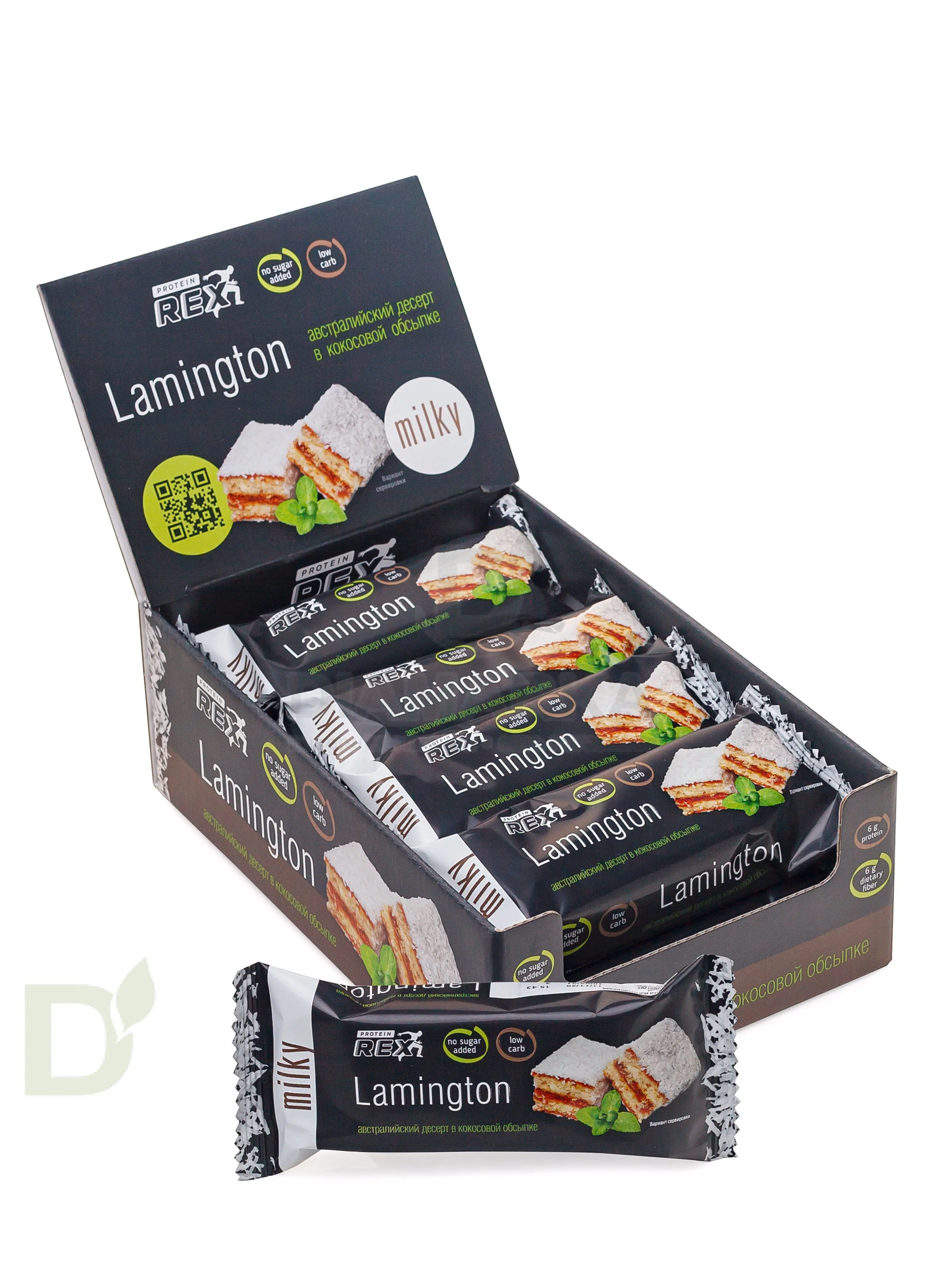 <h2>Вкуснейшее пирожное без сахара, лишних калорий и углеводов</h2> Все еще думаете, что диета - это скучно, пресно и невкусно? Только не с вкусняшками от Protein Rex. Protein Rex - настоящая находка для тех, кто соблюдает диету, не ест сахар и сахаросодержащие продукты, болеет диабетом, занимается спортом и просто соблюдает здоровый образ жизни.<br> <br> <h3>Диета без срывов - это реальность!</h3> Особенности и преимущества пирожных Protein Rex:<br> <ul> <li>в составе нет сахара, вместо него - низкокалорийный подсластитель нового поколения изомальт</li> <li> десерт обогащен пребиотиком</li> <li> пониженное содержание калорий и минимум углеводов</li> <li> натуральный и приятный вкус любимого десерта</li> </ul> Масса нетто: 50 грамм<br> <h3>Состав пирожного Ламингтон молочный</h3> протеиновый комплекс (белок яичный, концентрат молочного белка); стружка кокосовая; подсластители: изомальт, эритрит; масло кокосовое; изомальтоолигосахариды (пребиотик); масло растительное; вода питьевая; мука пшеничная; молоко сухое обезжиренное; желток яичный; мука миндальная; загустители: полидекстроза, крахмал модифицированный, каррагинан; влагоудерживающий агент глицерин; эмульгатор лецитин соевый; разрыхлитель гидрокарбонат натрия (сода пищевая); соль; ароматизаторы натуральные; консервант сорбат калия.<br> <h4>Пищевая и энергетическая ценность на пирожное</h4> белки - 6<br> жиры - 13<br> углеводы - 8,3<br> пищевые волокна - 6<br> 190 ккал