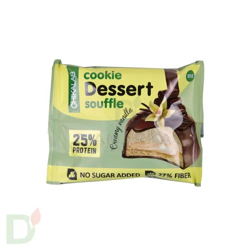 <h2>Низкоуглеводный ПП-десерт без сахара</h2> Продукцию для спортивного питания уже давно любят и уважают не только спортсмены, но и люди с диабетом, те кто соблюдает диету и просто следит за своим рационом. А почему нет? Ведь протеиновые вкусняшки - здоровая альтернатива обычным десертам, батончикам, печеньям.<br> <br> <h3>В чем польза печенья Чикалаб Суфле?</h3> <ul> <li>высокое содержание белка (25%) = длительное насыщение</li> <li> повышенное содержание клетчатки (27%) также дает чувство сытости + дарит пользу для ЖКТ</li> <li> примерно на треть меньше калорий, чем в классическом аналогичном десерте</li> <li> десерт не содержит сахара!</li> <li> низкое содержание углеводов (в среднем 4 грамма на порцию)</li> </ul> Протеиновое печенье с суфле и начинкой - полноценный, здоровый, питательный и невероятно вкусный десерт. Берите с собой, куда бы ни отправлялись, и не переживайте, что вас настигнет чувство голода.<br> <br> Масса печенья 55 грамм<br> <h3>Пищевая и энергетическая ценность на 1 печенье</h3> 14 б<br> 8,8 ж<br> 3,1 у<br> 15 грамм пищевых волокон<br> 177 ккал<br> <h4>Состав протеинового десерта</h4> белки молочные (концентрат сывороточного белка, концентрат молочного белка), водорастворимые волокна кукурузы, молочный шоколад (водорастворимые волокна кукурузы, масло какао, какао тёртое, молоко сухое обезжиренное, эмульгатор(соевый лецитин), ароматизаторы натуральные, подсластитель (сукралоза)), суфле (олигофруктоза, вода, яичный белок, желатин говяжий, соль, ароматизаторы натуральные, регулятор кислотности (лимонная кислота), антиокислитель (аскорбиновая кислота), подсластитель (сукралоза), консервант (сорбат калия)), паста белая молочная с кешью (кешью, водорастворимые волокна кукурузы, изолят сывороточного белка, кокосовое масло, молоко сухое обезжиреное, эмульгатор (соевый лецитин), ароматизаторы натуральные, антиокислитель (аскорбиновая кислота), подсластитель(сукралоза)), масло кокосовое, вода, агент влагоудерживающий (глицерин), продукты яичные (меланж яичный), соль, ароматизаторы натуральные, регуляторы кислотности (гидрокарбонат натрия (сода пищевая), лимонная кислота), эмульгатор (соевый лецитин), подсластитель (сукралоза), консервант (сорбат калия).