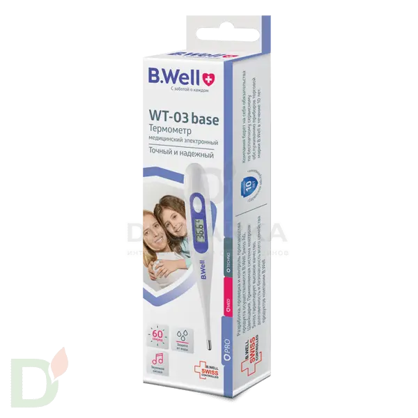 <h2>Автоматический термометр - правильный выбор!</h2> Ртутные термометры уже давно канули в лету. На смену им пришли инфракрасные и электронные девайсы. Такие приборы гораздо более удобны и гигиеничны в применении, а также точны и безопасны! Нет рисков разбить градусник и пораниться осколками или отравиться парами ртути.<br> <br> <h3>Характеристика термометра WT-03 base</h3> <ul> <li>Быстрое и точное измерение за 60 секунд</li> <li> Покажет последнее измерение</li> <li> Термометр сделан из безопасного пластика и не содержит ртути и стекла</li> <li> Термометр не боится воды. Специальные водонепроницаемые вставки защищают прибор от попадания воды внутрь.</li> <li> Звуковой сигнал сопровождает процесс измерения, помогает правильно использовать термометр</li> <li> Специальный сигнал при повышенной температуре</li> <li> Автоотключение экономит заряд батареи</li> <li> Футляр для удобного хранения</li> <li> Для дома и медицинских учреждений</li> </ul> <h3>Комплектация</h3> Термометр<br> Элемент питания (батарейка)<br> Защитный футляр<br> Гарантийный талон<br> Инструкция по эксплуатации