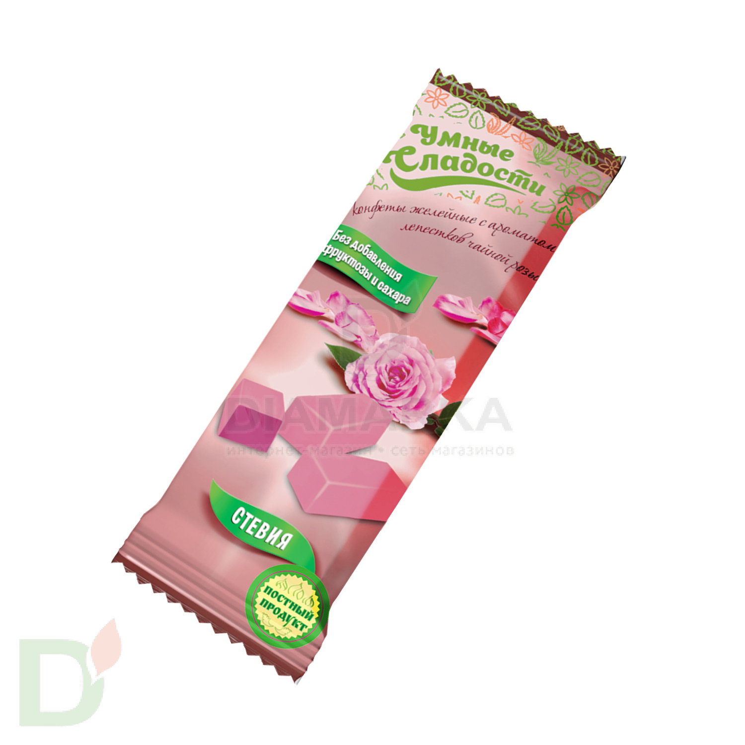 <h2>Правильные конфеты для правильных чаепитий</h2> Конфеты = сладость = много сахара. Такая установка сидит в голове у большинства людей. Хорошо, что мы живем в 21 веке и конфеты без сахара и его аналогов - вполне себе реальность, а не мечта!<br> <h2>Преимущества конфет без сахара</h2> <ul> <li>низкая скорость усвоения углеводов</li> <li> меньше калорий (в сравнении с обычными конфетами)</li> <li> не провоцируют развития кариеса</li> <li> ПРИ ЭТОМ по вкусу неотличимы от обычных конфет!</li> </ul> <h2>Что дает сладость</h2> Как было сказано выше, умные сладости не содержат сахара и его углеводных заменителей. Вместо них используются изомальт и стевия - природные низкокалорийные заменители, которые не оказывают на организм столь вредного воздействия, как сахар и аналоги.<br> <br> Масса: 90 грамм<br> <br> Срок годности 4 месяца<br> <h2>Состав конфет Чайная роза</h2> патока, изомальт, загуститель-пектин, регулятор кислотности-кислота лимонная, влагоудерживающий агент-лактат натрия, ароматизатор «Чайная роза», краситель пищевой, подсластитель-стевия.<br> <h2>КБЖУ на 100 грамм конфет</h2> 246 ккал<br> б - 0,4<br> ж - 0<br> у - 63,8
