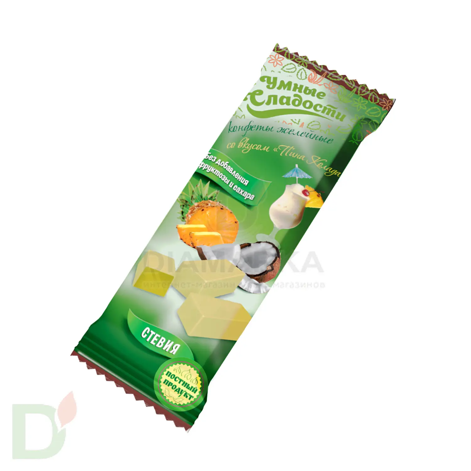 <h2>Правильные конфеты для правильных чаепитий</h2> Конфеты = сладость = много сахара. Такая установка сидит в голове у большинства людей. Хорошо, что мы живем в 21 веке и конфеты без сахара и его аналогов - вполне себе реальность, а не мечта!<br> <h2>Преимущества конфет без сахара</h2> <ul> <li>низкая скорость усвоения углеводов</li> <li> меньше калорий (в сравнении с обычными конфетами)</li> <li> не провоцируют развития кариеса</li> <li> ПРИ ЭТОМ по вкусу неотличимы от обычных конфет!</li> </ul> <h2>Что дает сладость</h2> Как было сказано выше, умные сладости не содержат сахара и его углеводных заменителей. Вместо них используются изомальт и стевия - природные низкокалорийные заменители, которые не оказывают на организм столь вредного воздействия, как сахар и аналоги.<br> <br> Масса: 90 грамм<br> <br> Срок годности 4 месяца<br> <h2>Состав конфет Пина-колада</h2> патока, изомальт, загуститель-пектин, регулятор кислотности-кислота лимонная, влагоудерживающий агент-лактат натрия, ароматизатор «Ананас», «Кокос», «Ром», краситель пищевой, подсластитель-стевия.<br> <h2>КБЖУ на 100 грамм конфет</h2> 246 ккал<br> б - 0,4<br> ж - 0<br> у - 63,8