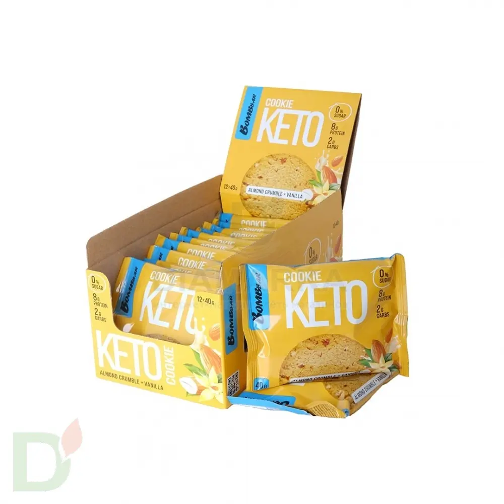 <h2>Кето-печенье Бомббар - полноценный сытный перекус</h2> Высокое содержание качественных жиров и белка делает это печенье суперпитательным и сытным перекусом. Когда захотелось перекусить находу, когда нет времени думать о том "чего бы такого съесть", да и просто если очень хочется сладенького - кето-печенье Bombbar придет на помощь! Обычное печенье даст вам сытость на 30, максимум 60 минут, так как содержит в основном простые углеводы. Наша новинка зарядит вас энергией и хорошим настроением на более длительное время!<br> <h2>Не только вкус, но и польза</h2> Помимо насыщенного вкуса и чувства сытости это печенье подарит вам невероятную пользу. Ведь оно:<br> <ul> <li>Сделано на основе миндаля, а значит содержит полезные ненасыщенные жиры, а также массу витаминов и микроэлементов</li> <li> Не содержит муки и сахара! Вместо сахара используются пребиотический подсластитель олигофруктоза и сукралоза</li> <li> Обогащено пищевыми волокнами, которые необходимы для правильной работы ЖКТ!</li> </ul> <h2>Состав кето-печенья Бомббар</h2> миндаль, концентрат сывороточного белка, масло кокосовое, водорастворимые волокна кукурузы, олигофруктоза(пищевые волокна из цикория), вода, эритрит, продукты яичные (меланж яичный), соль, ароматизаторы натуральные, гидрокарбонат натрия(сода пищевая), регулятор кислотности - лимонная кислота, эмульгатор(соевый лецитин), антиокислитель (аскорбиновая кислота), подсластитель - сукралоза, консервант (сорбат калия).<br> <h2>КБЖУ на 1 порцию / 1 печенье</h2> <ul> <li>Б - 8г</li> <li> Ж - 13г</li> <li> У - 2г</li> <li> Клетчатка - 7,6г</li> <li> Ккал - 172</li> </ul> Срок годности печенья - 9 месяцев<br> Масса нетто: 40 грамм