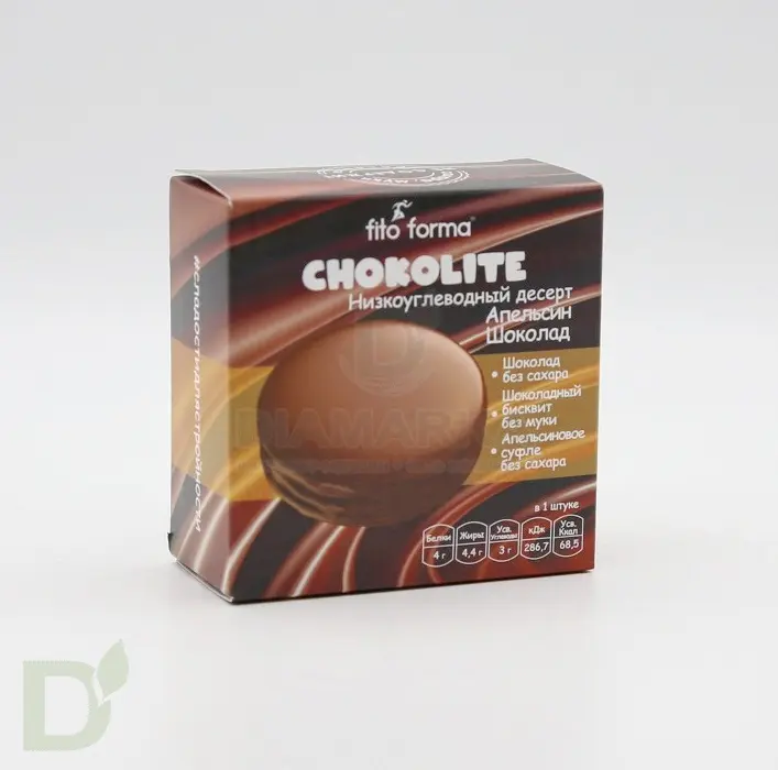 <h2>Выбирайте правильные десерты</h2> Правильные - это без муки, сахара и искусственных компонентов! А приятным бонусом в таких десертах идет низкая калорийность и содержание углеводом, а также средний гликемический индекс. Сочетание вкусов и текстур десертов FrutoLite не оставить вас равнодушными.<br> <h2>Польза для ЖКТ, безопасно для фигуры</h2> Основа десерта - бисквит - изготовлен из ореховой муки, а вместо сахара используются природные подсластители. Кроме того, состав обогащен пребиотиками, которые так любят полезные бактерии, живущие в желудочно-кишечном тракте. Польза для пищеварения очевидна!<br> <h2>Состав шоколадно-апельсинового десерта</h2> натуральные подсластители: эритритол, мальтит, стевиозид; изомальтоолигосахарид (пребиотик), вода, яичный меланж, какао тертое, какао масло, сыворотка молочная сухая, растительные пищевые волокна, изолят сывороточного протеина, какао порошок, желатин, пребиотик инулин, регулятор кислотности лимонная кислота, натуральный ароматизатор, консервант сорбат калия, разрыхлитель, эмульгатор соевый лецитин.<br> <h2>Усваиваемые ккал: 124,5 кКал</h2> 18 г пищевые волокна<br> 7,3 г белки<br> 8,1 г жиры<br> 5,7 г углеводы<br> <br> Срок годности: 6 месяцев<br> Хранить при температуре от +2 до +25 градусов<br> Вес 55 г.