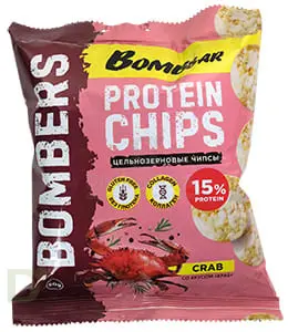 <h2>Хрустите чипсами без вреда для здоровья и фигуры</h2> Чипсы BOMBERS - это хрустящий цельнозерновой снек дополнительно обогащенный протеином и коллагеном. Идеален для вкусного, сытного и полезного перекуса. Чипсы не обжариваются, а запекаются, что позволяет при производстве использовать меньше масла, следовательно, калорийность продукта значительно снижается!<br> <br> <h3>Чипсы не содержат сахара, глютена и лишних жиров</h3> На пачку чипсов приходится ВСЕГО 2 грамма жира (в обычных чипсах его примерно в 15 раз больше) и на 40% меньше калорий. Продукт дополнительно обогащен коллагеном.<br> <br> Полезные чипсы бывают, и Бобмерс тому доказательство.<br> <br> Масса нетто: 50 грамм<br> <h3>Состав чипсов BOMBERS Краб</h3> крупа рисовая, гороховый белок, вода, ароматизатор "Краб", соль, гидролизат коллагена, масло подсолнечное рафинированное дезодорированное. <br> <h4>КБЖУ на пачку чипсов</h4> б - 8<br> ж - 2<br> у - 27<br> пищевые волокна - 1<br> 152 ккал